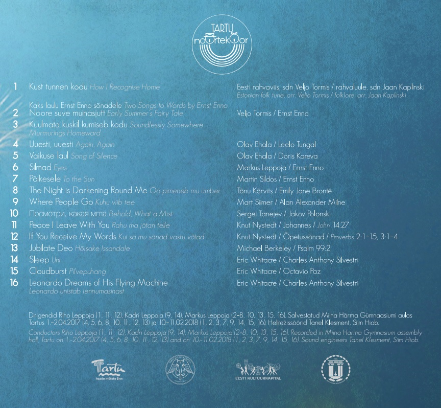 Tartu Youth Choir's CD "Lend" ("Flight") was recorded in April 2017 and February 2018, it includes 16 selected songs from the choir's recent repertoire. Albums title is inspired by the final part of "Leonardo Dreams of His Flying Machine", where the famous artist and inventor finally takes flight.